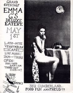 Emma G’s Deluxe Eatery began in Winnipeg at 352 Cumberland Avenue in 1989 and closed in 1991.